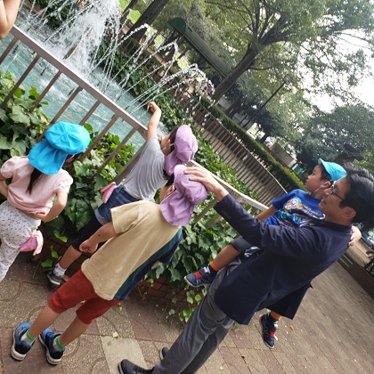 こうじ先生と会い、抱っこしてもらい、一緒に噴水を眺めました。