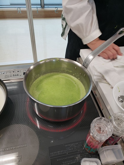 グリーンピーススープはとってもクリーミーで緑の良い香り。