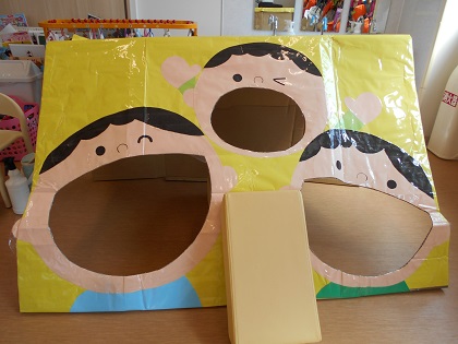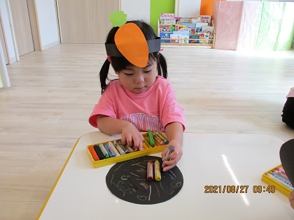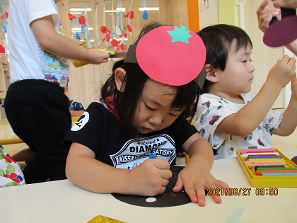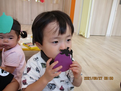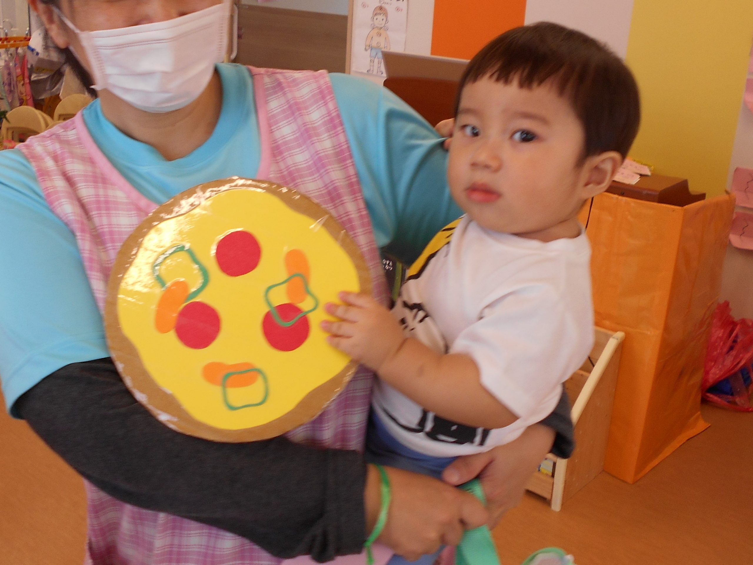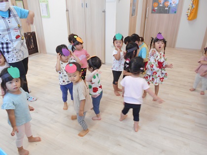 乳児クラス(0・1・2歳児クラス)の皆さんは、食べ物のお面をかぶってお祭りスタート!!