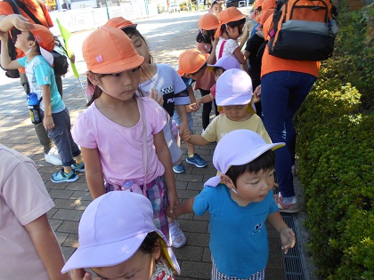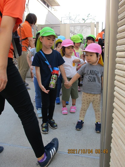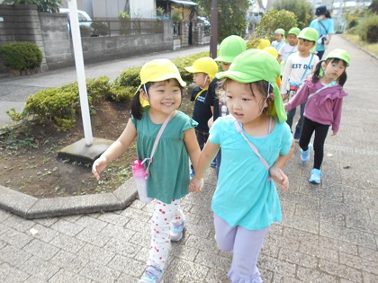 こちらは逆に、年長さんが小さいお友だちの歩くペースに合わせて手をつないでくれています。