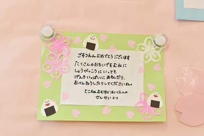 乳児クラスの先生たちがお祝いの気持ちを込めて作ってくれました。