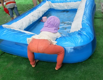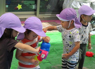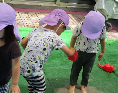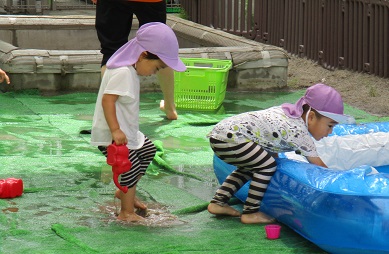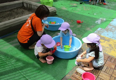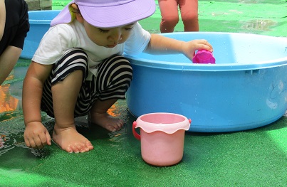 プールやたらいに少ーしだけ水をはり、自由に水遊びをします。