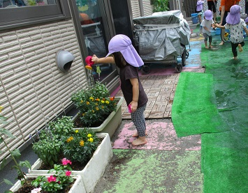 お花や夏野菜に囲まれて、のびのびと水遊びができることちゃん保育園の子は幸せです。