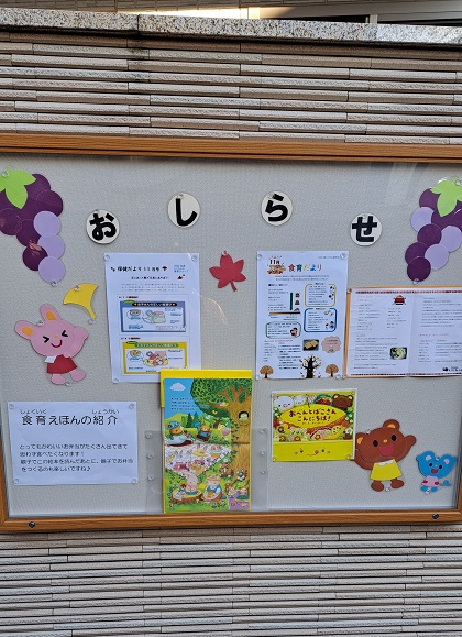 とこちゃん保育園の掲示板には毎月の食育だよりや保健だよりが掲示されています。