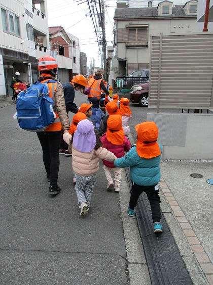 園庭避難、廊下避難、近隣小学校への避難、近隣プロムナードへの避難等、職員は近隣の状況を把握し、災害状況に適した避難先をシュミレーションしています。