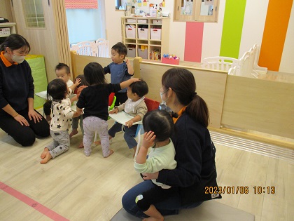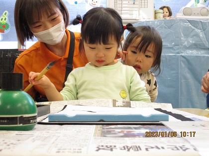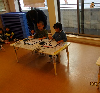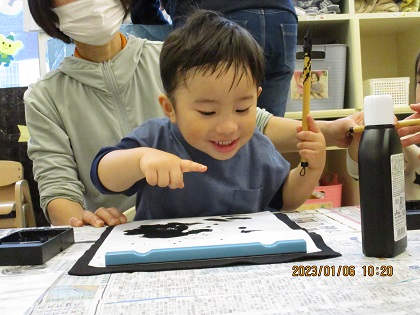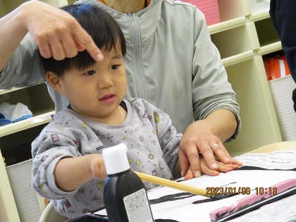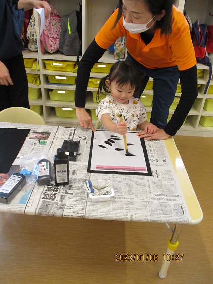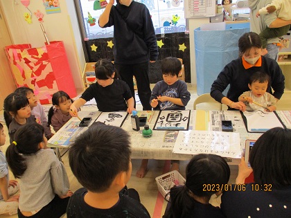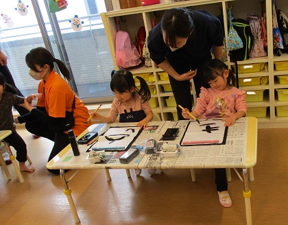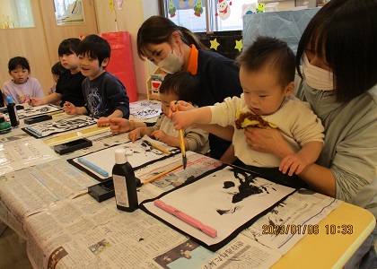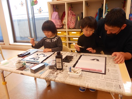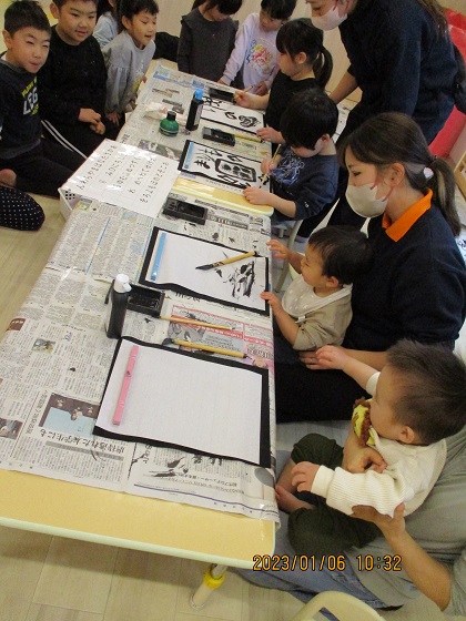 とこちゃん保育園では、小さい子が大きい子に見守られ、安心した環境のなかで書初めをしましたよ。