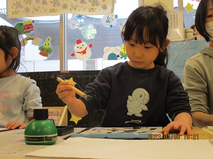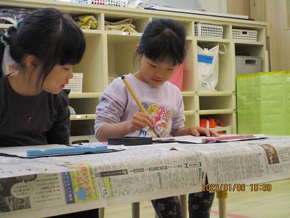 お兄さんお姉さんのおかげで、のびのび元気に書初めをしていました。
