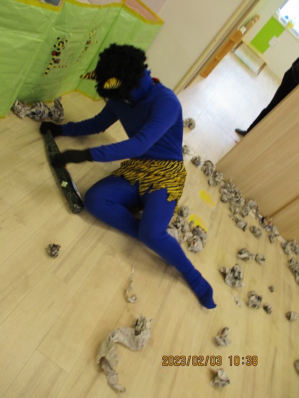 最初はね、先生たちが作った鬼さんに豆(新聞紙を丸めたもの)をなげて楽しんでいたのだけれど・・・
