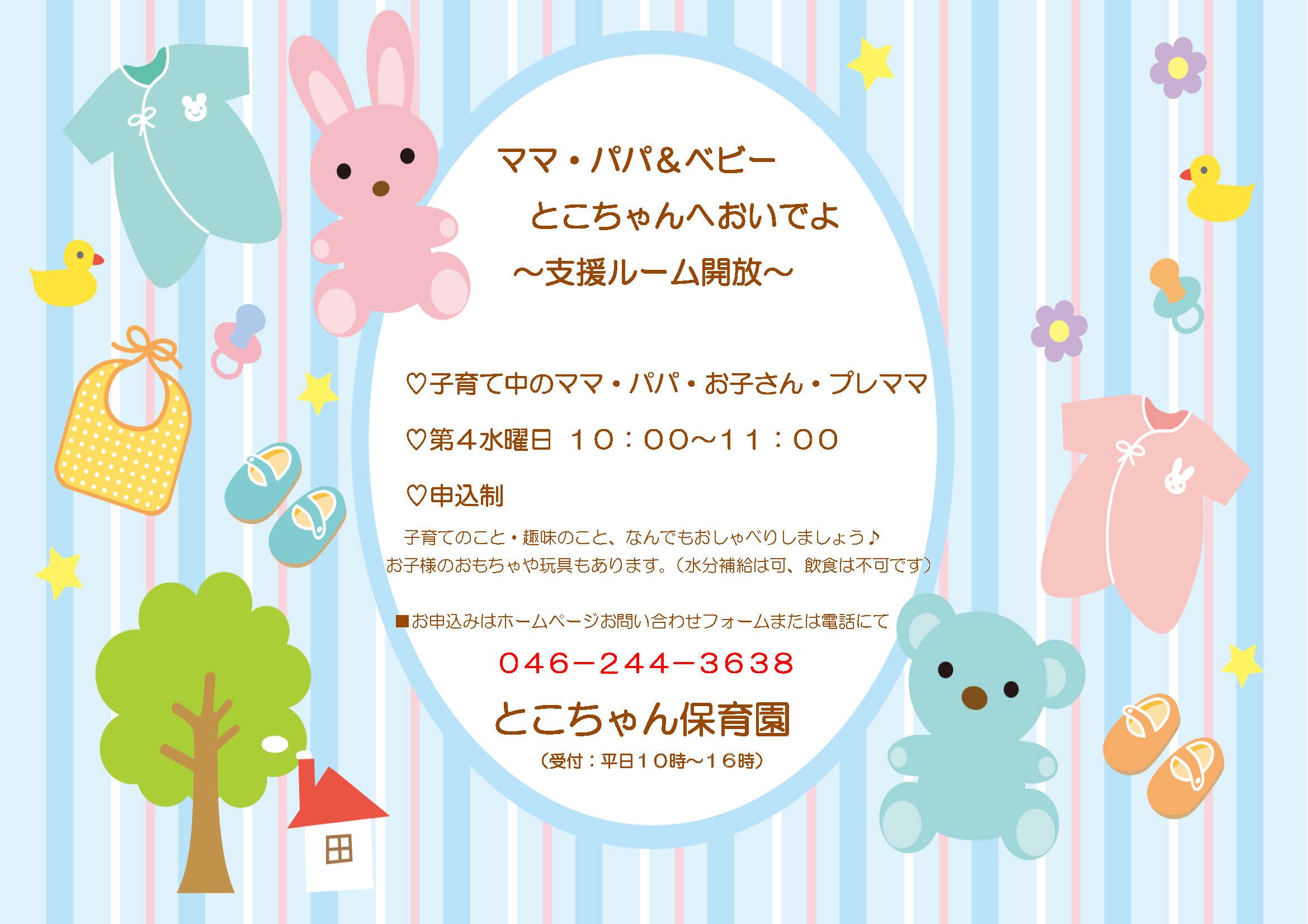 お知らせ 子育て支援ルーム開放のご案内 とこちゃん子育て支援ルームを月1回開放します♪ お子様とごいっしょにお気軽に遊びに来てくださいね。 関連記事新聞あそびチューリップの球根🌷これなぁに??とこちゃん🌸ひなまつり🎎おだんごさんのクリスマス♪クッキー☆クッキング★彡 2023-04-11 | Posted in お知らせ | No Comments » < おはなしとこちゃん受付中(残席わずか) 保育&子育てについておしゃべりします >