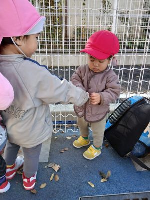 年上クラスのお友だちが優しく落ち葉を拾ってくれたよ♪