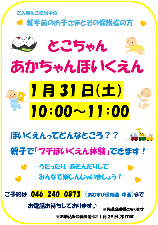 中央林間のとこちゃんおむすび保育園で、入園をご検討の方を対象に『あかちゃん保育園』を開催します!
