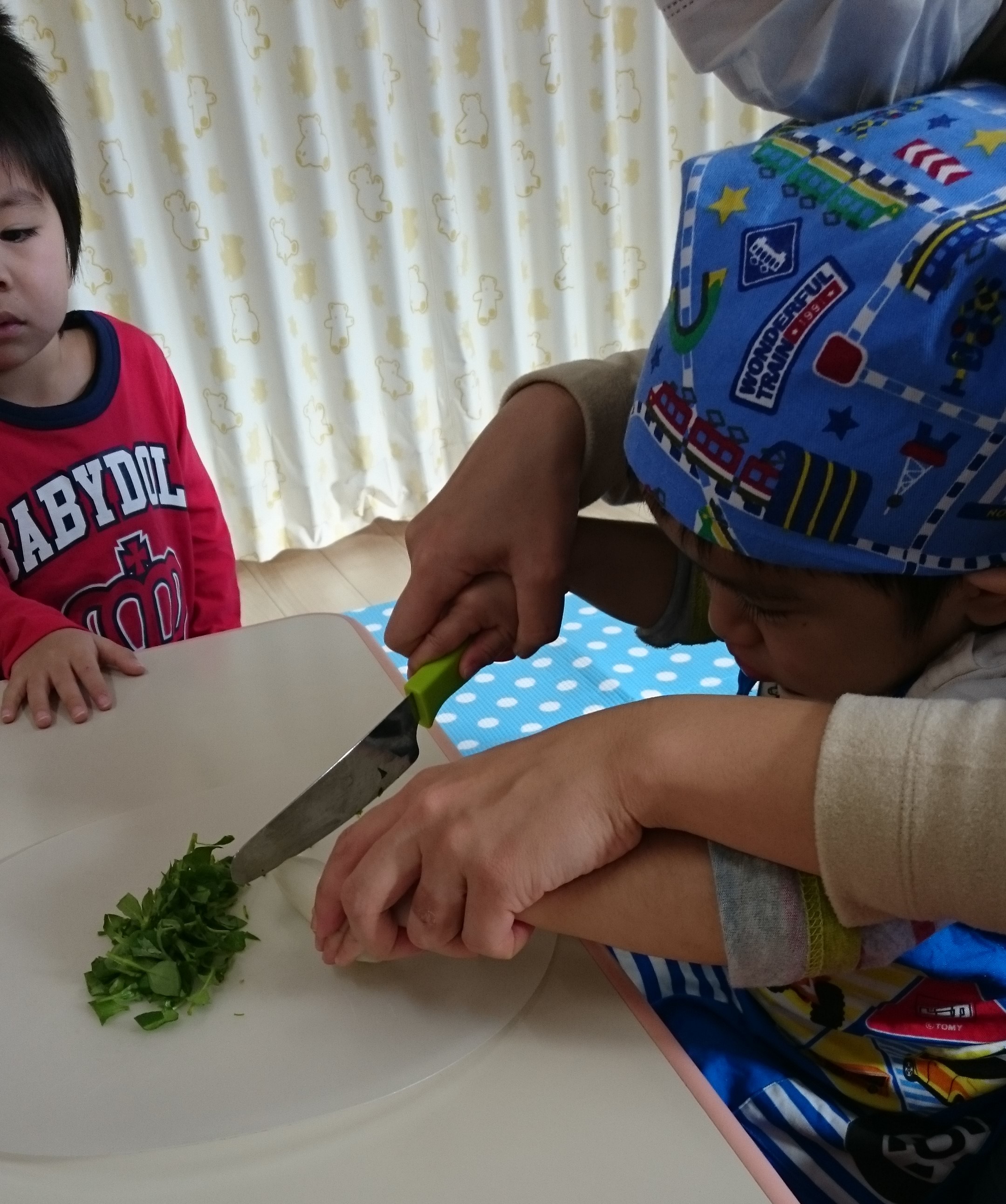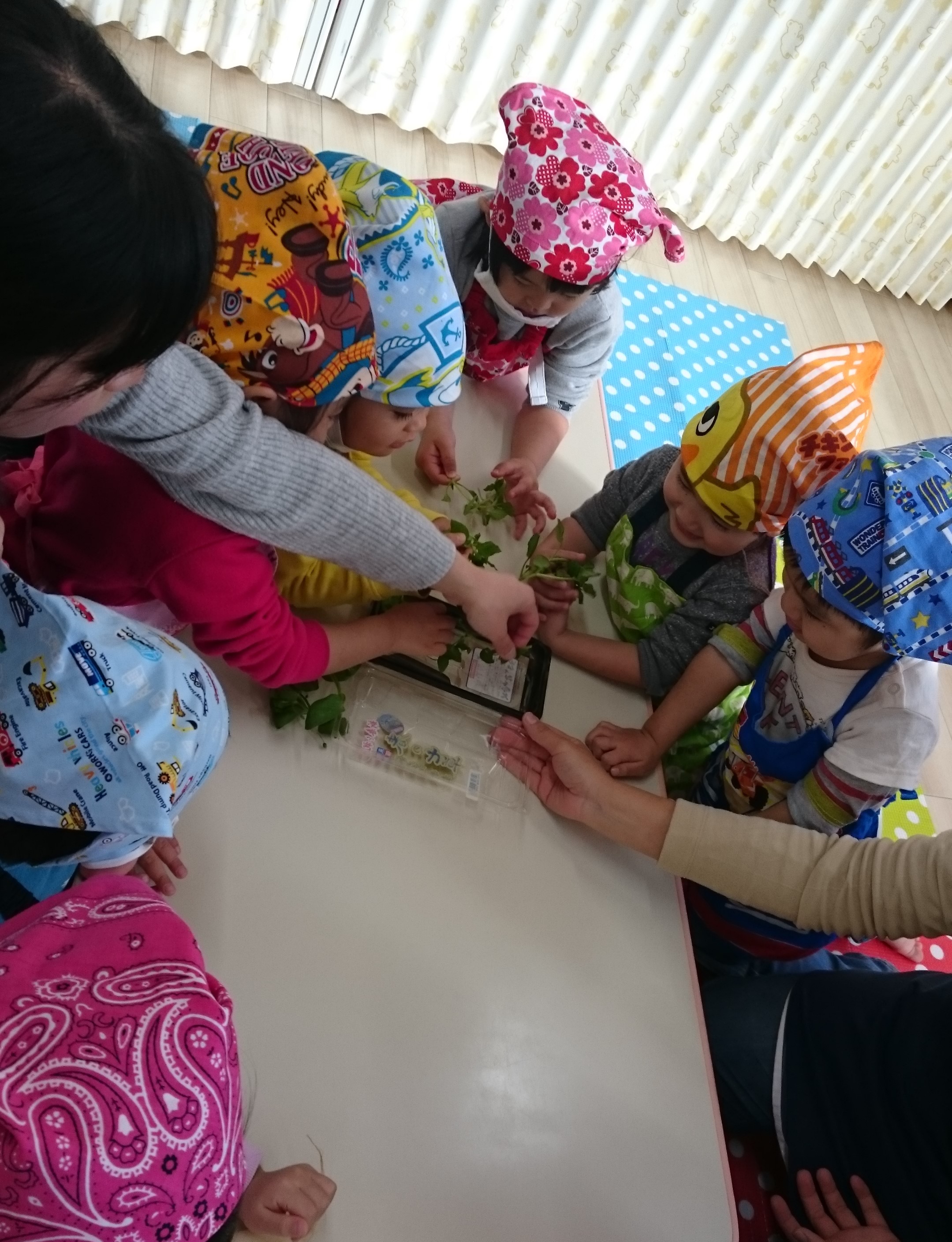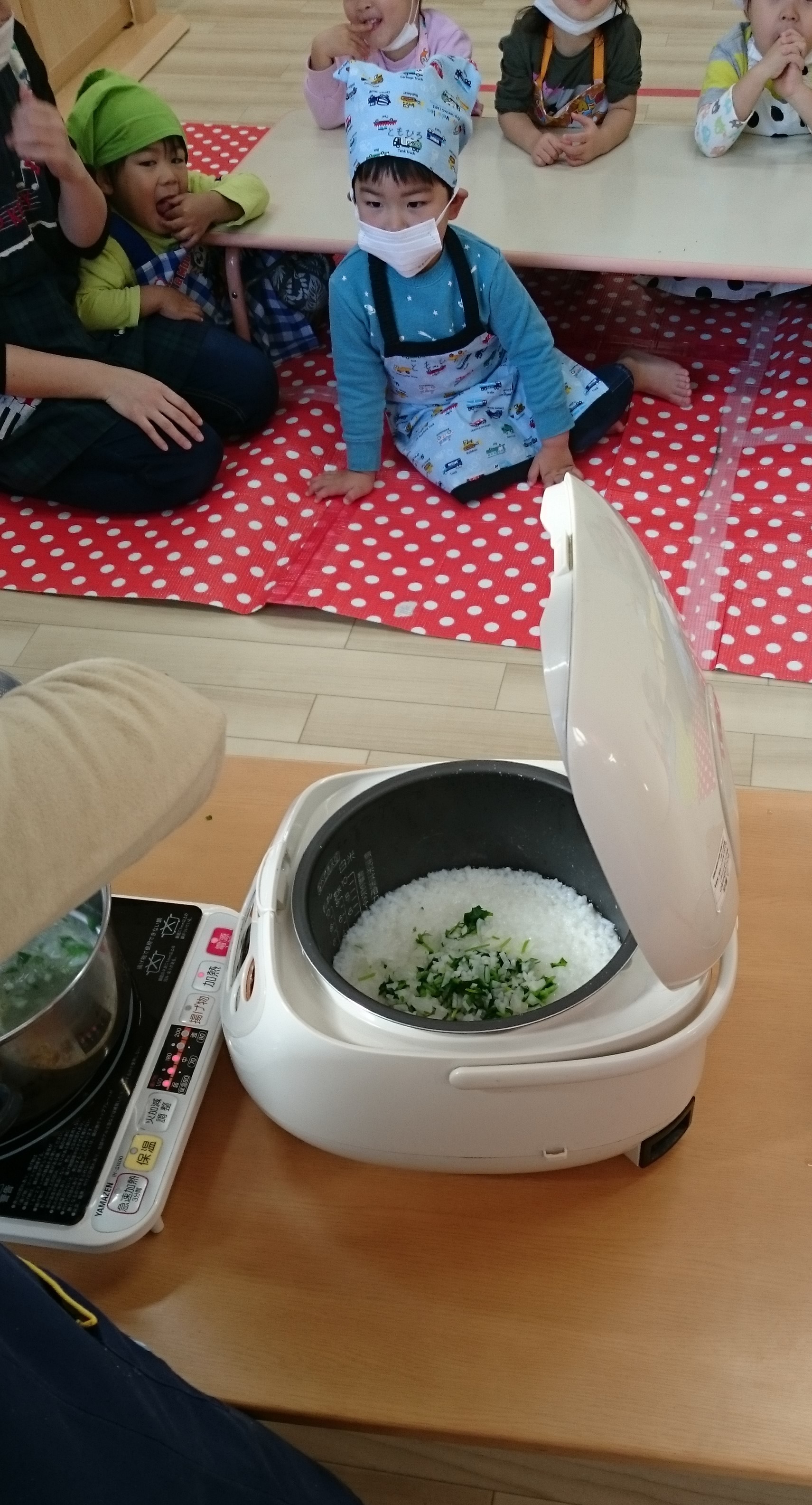 湧きあがる湯気から更に七草の香りが保育室じゅうに広がります。