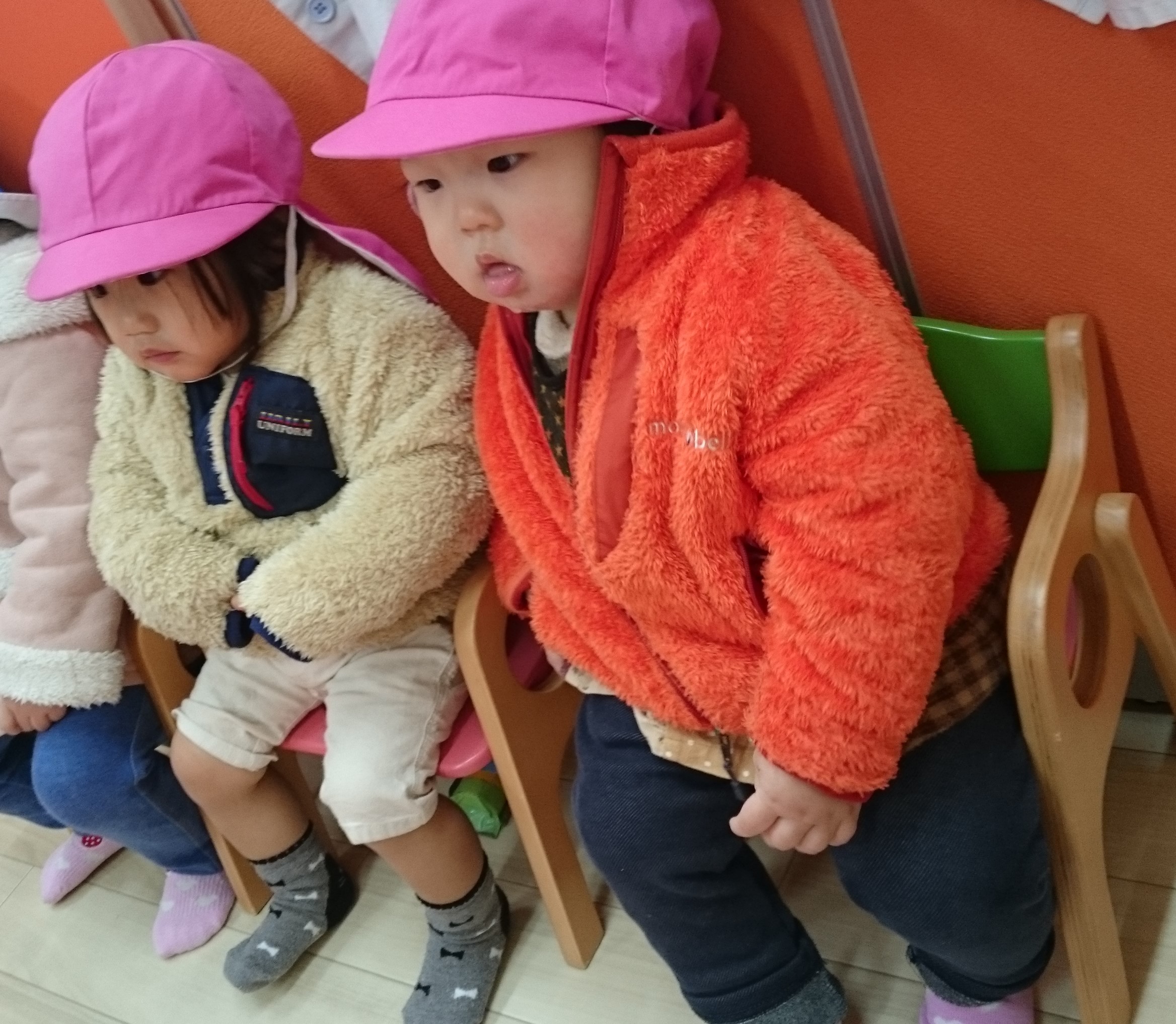 意欲的なおふたりさん、たまたま保育室の端に置いてあった椅子を発見して自ら着席。