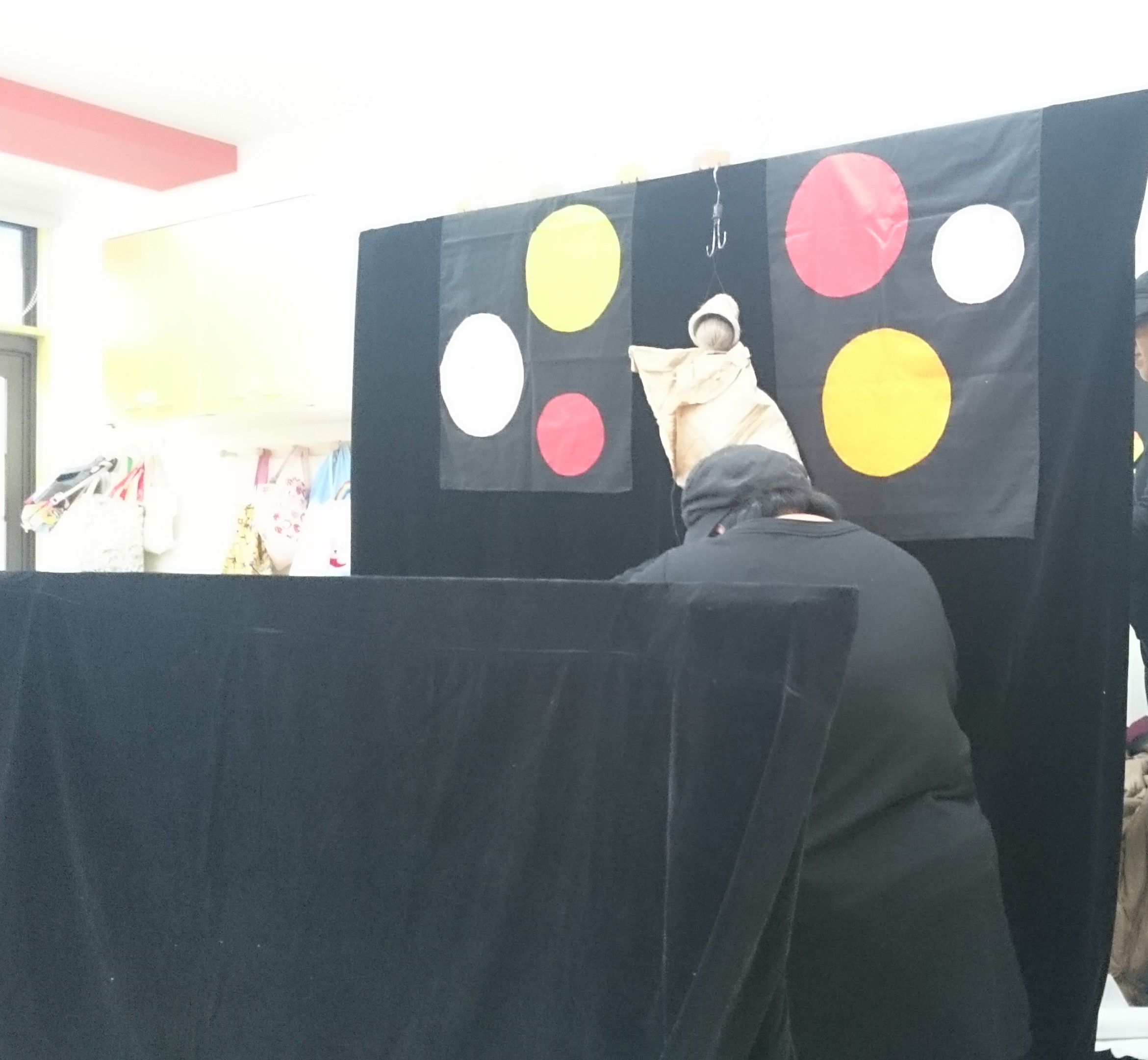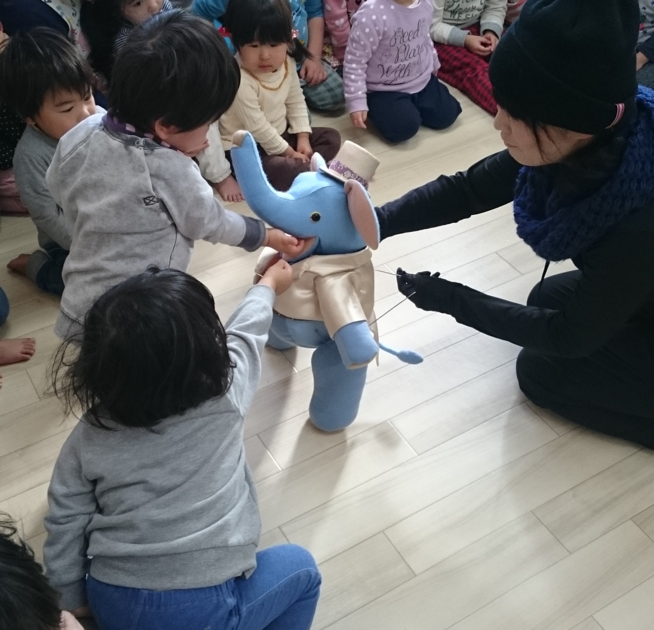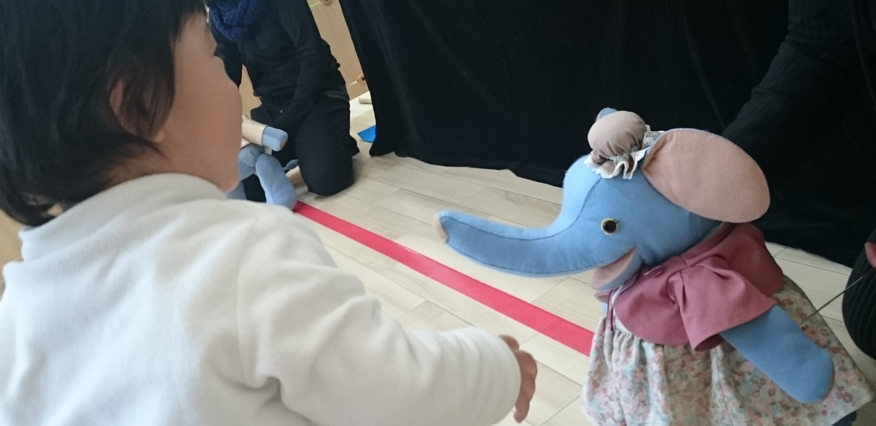 唐突に人形劇を始めるのではなく、まずは子どもたちの目線に座って