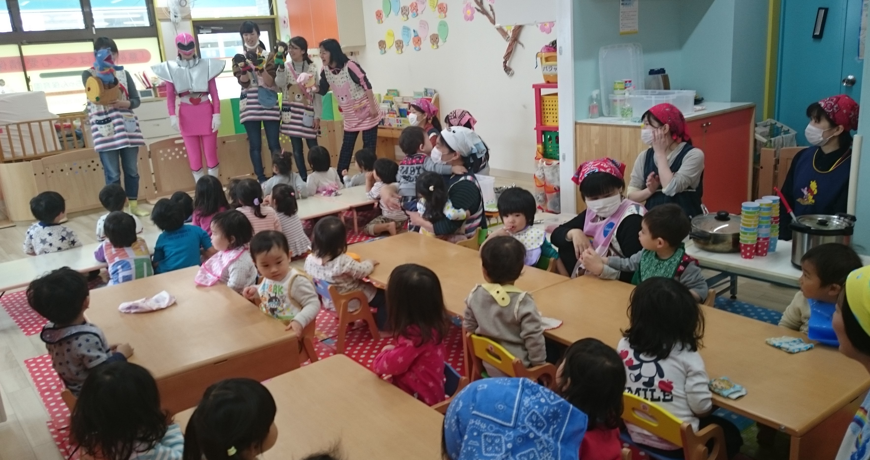 とこピンクの登場に、大喜びな子、しがみつく子、かたまる子・・そして