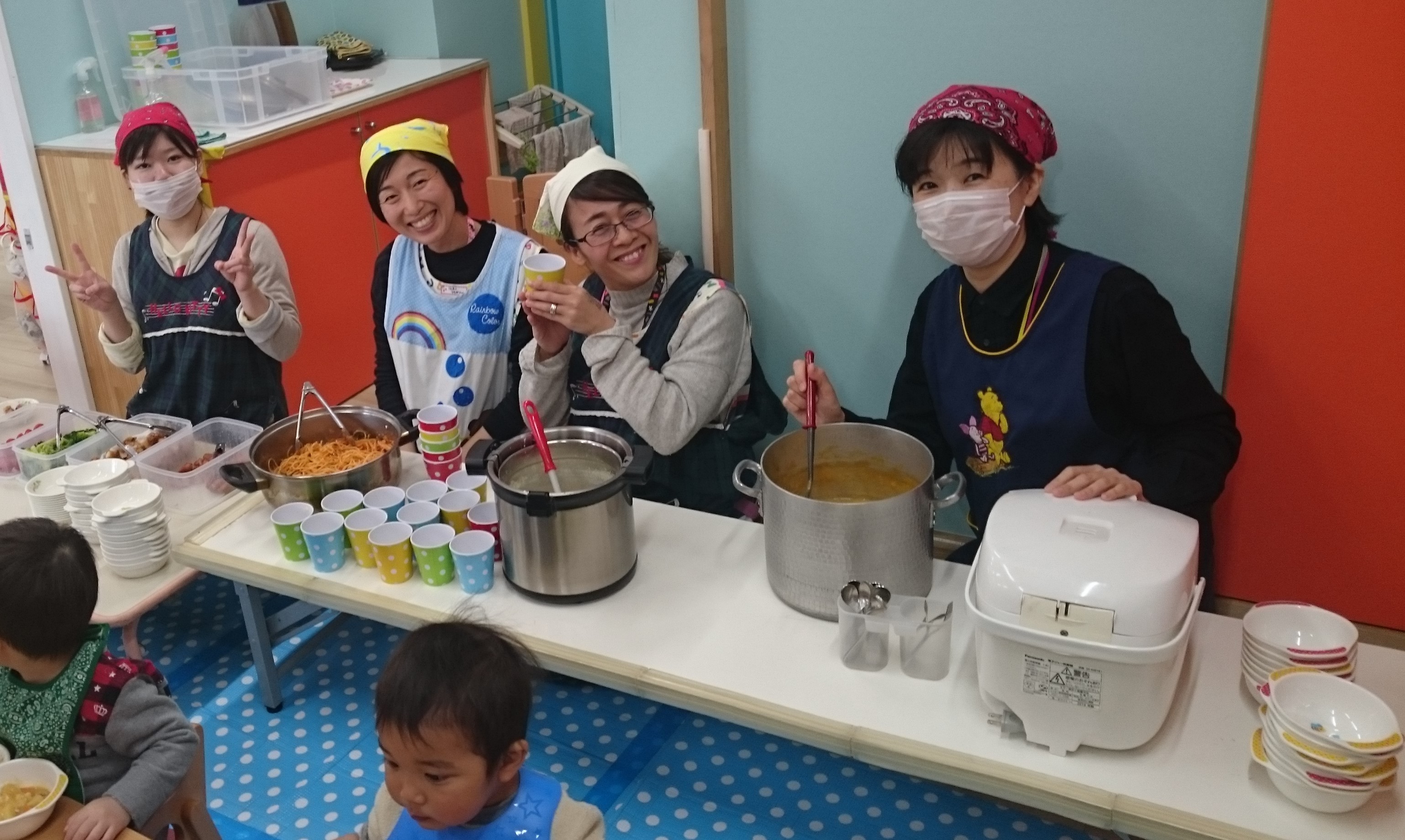 今年もおいしい給食をありがとう!一番左が調理師のゆか先生、一番右が調理師&栄養士のみえ先生です。