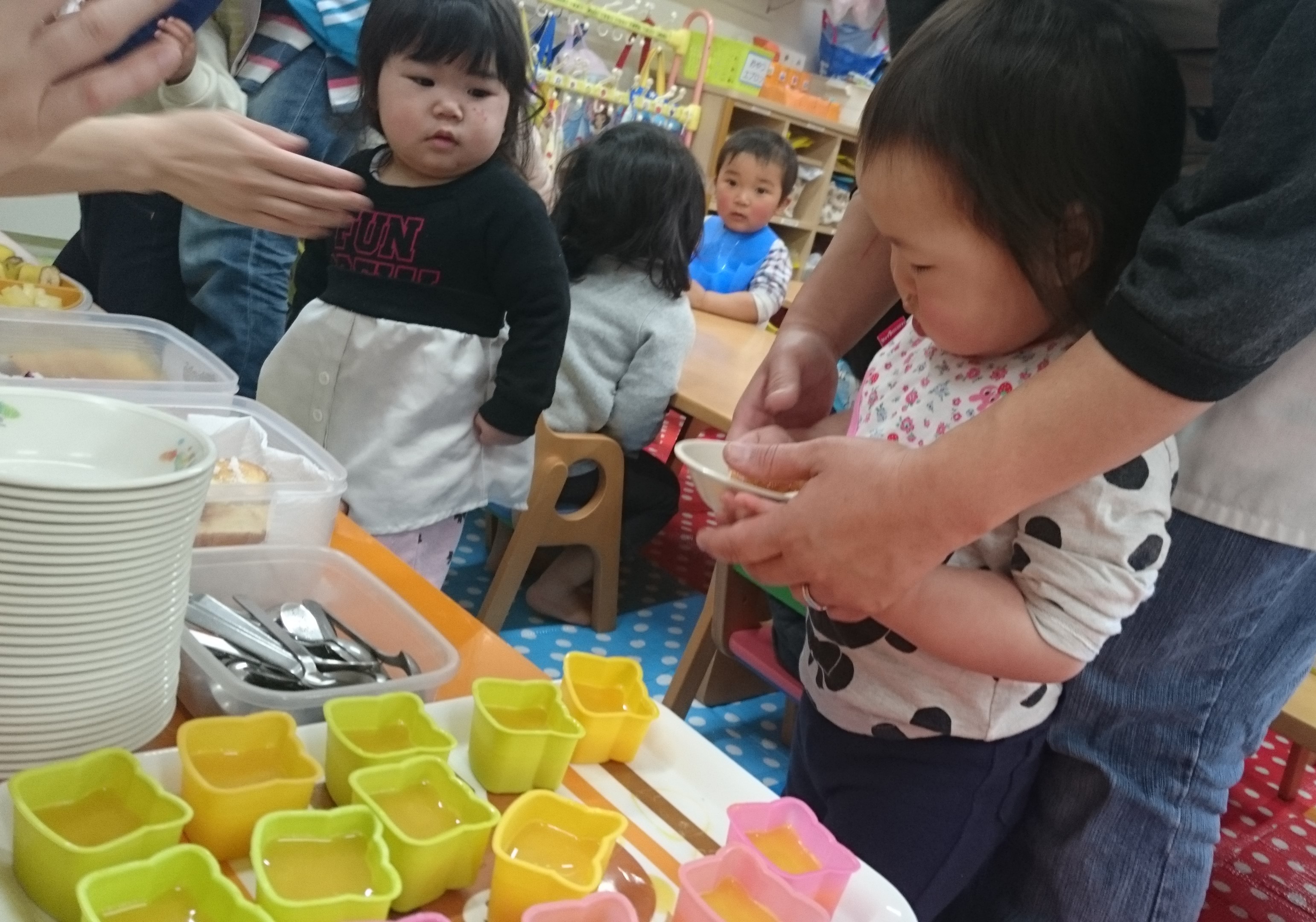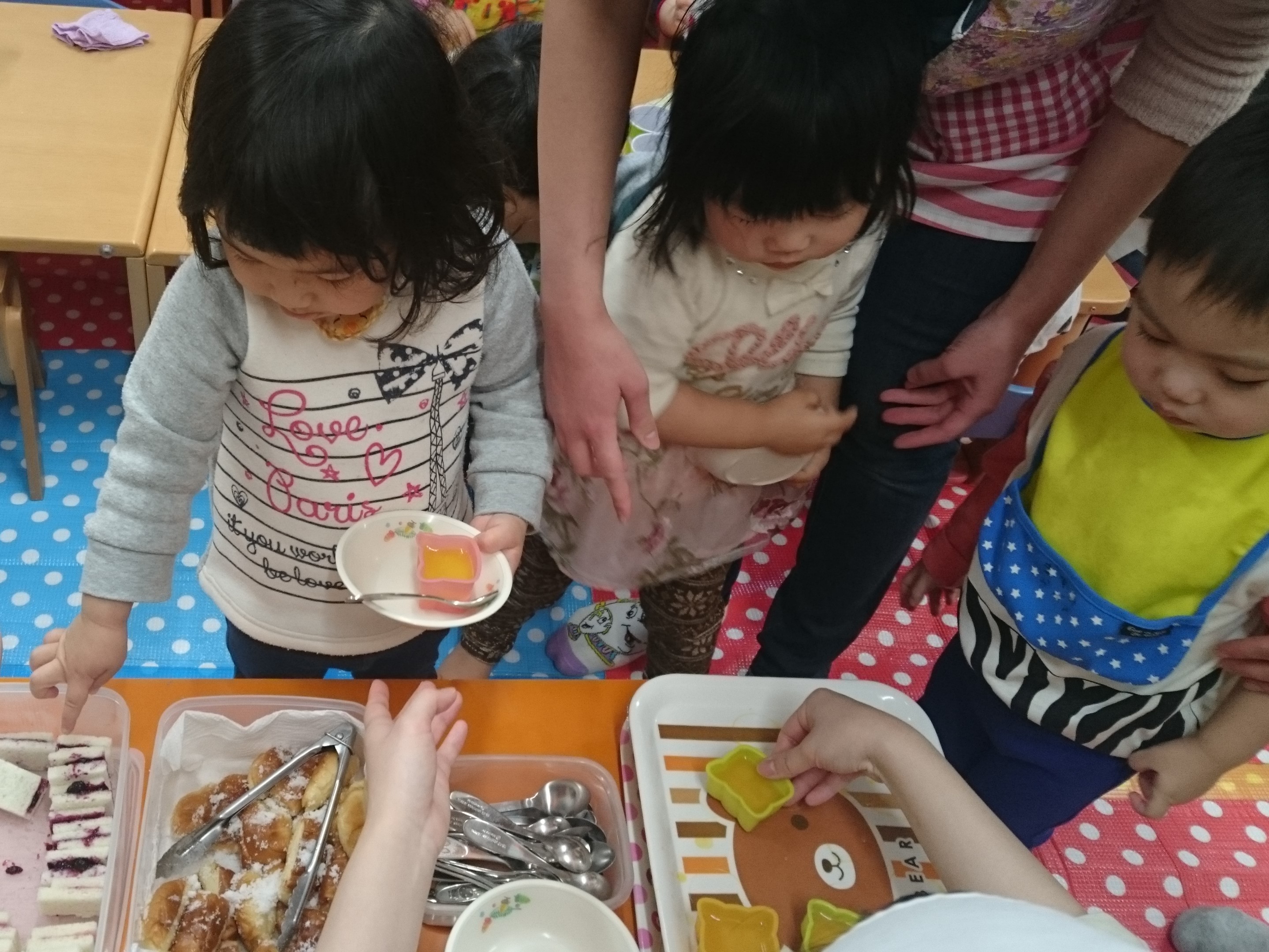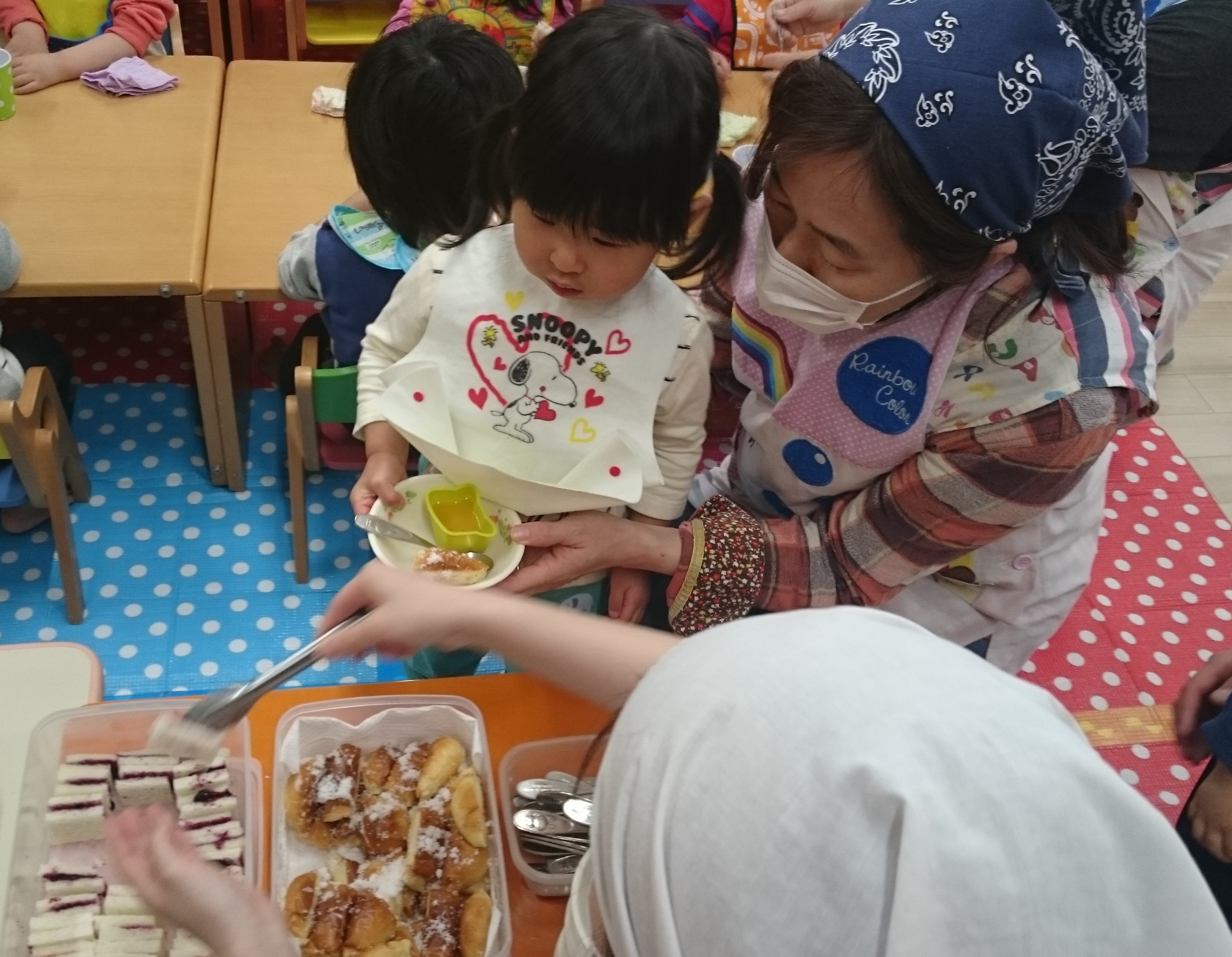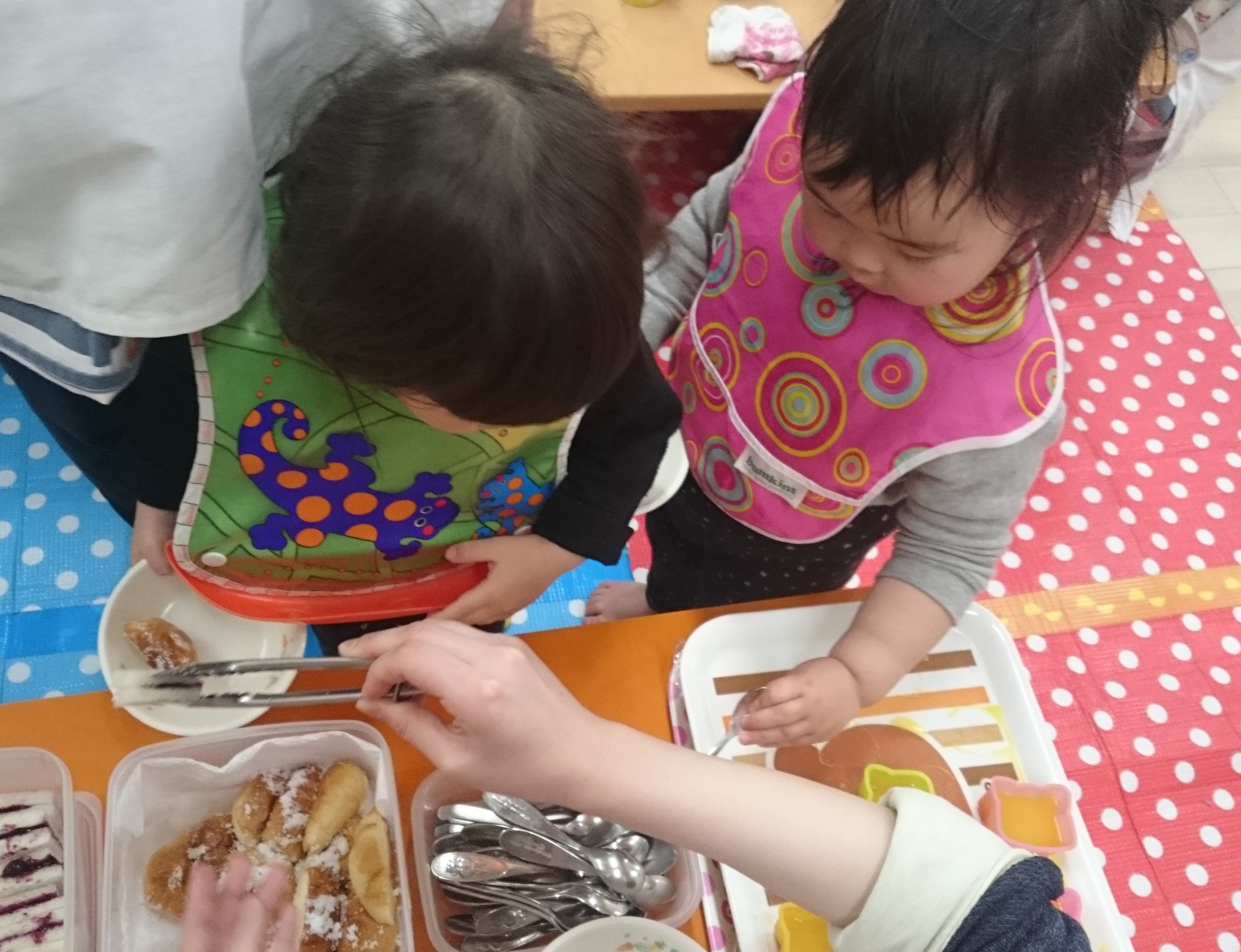 とこちゃんでは、いつでも「ちいさい子ファースト」なので、今日もいちごぐみ・ひよこぐみからバイキングコーナーへ。