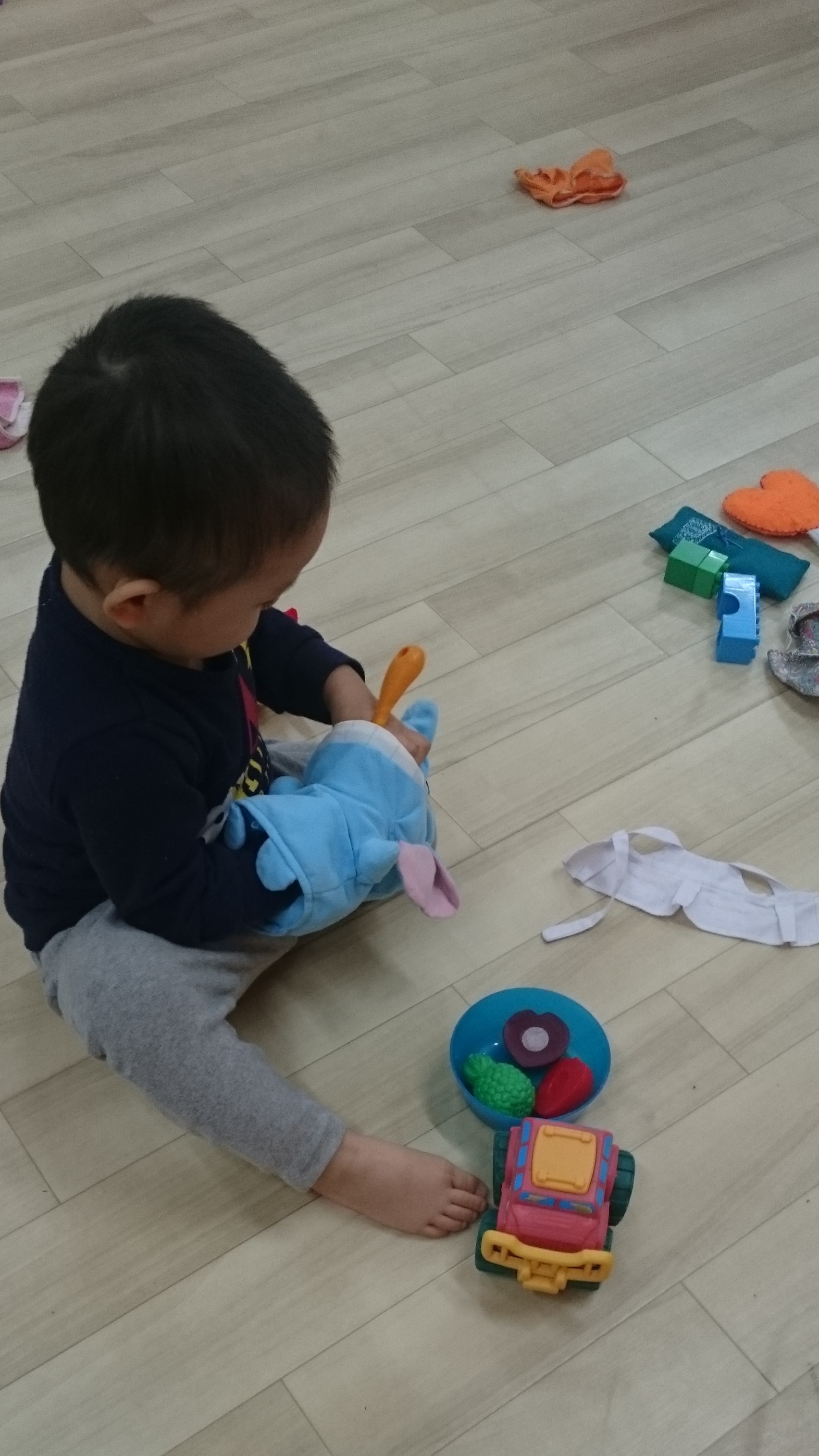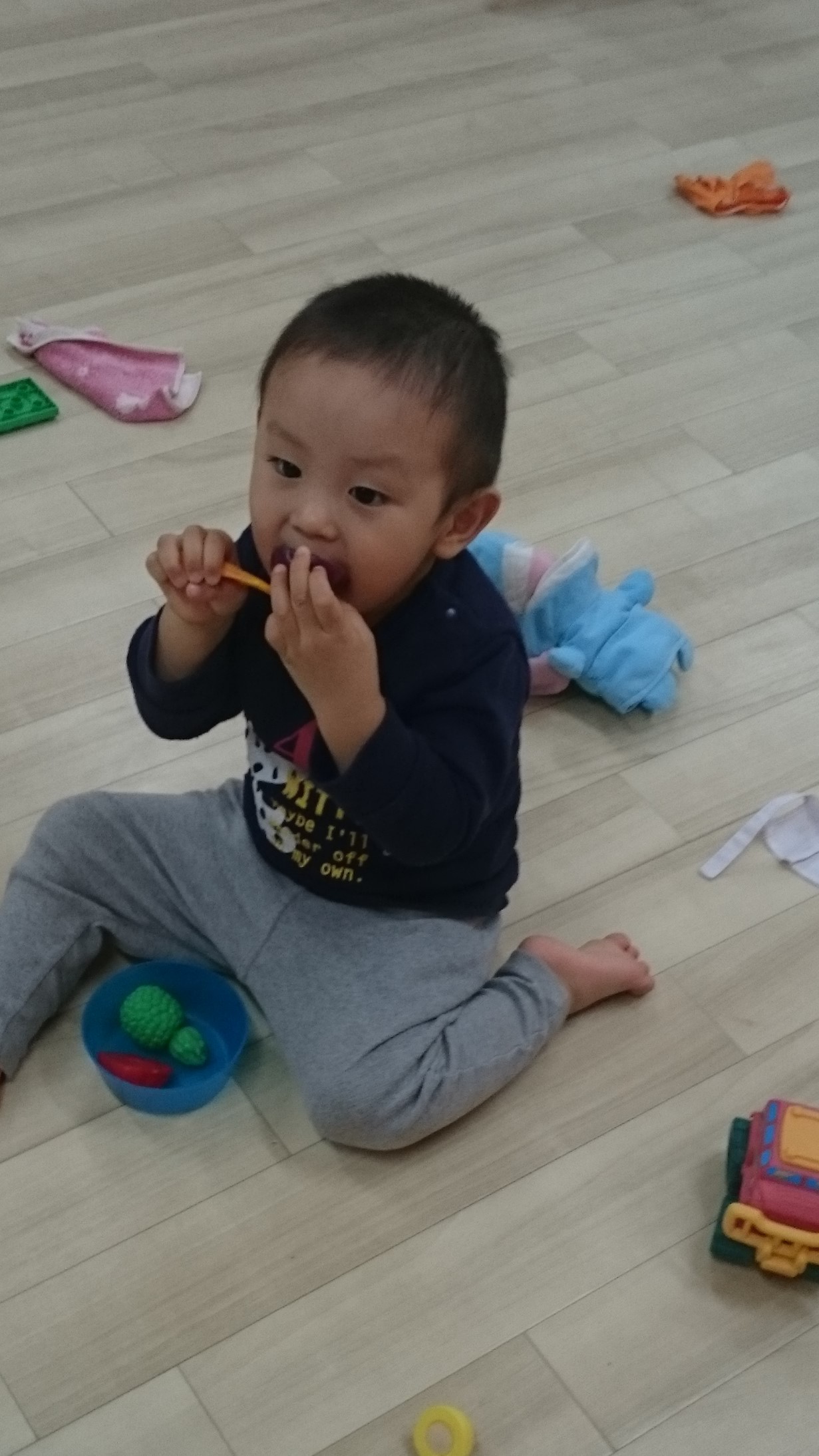 1歳児のぼくも、しまじろうくんにご飯を食べさせてあげています。