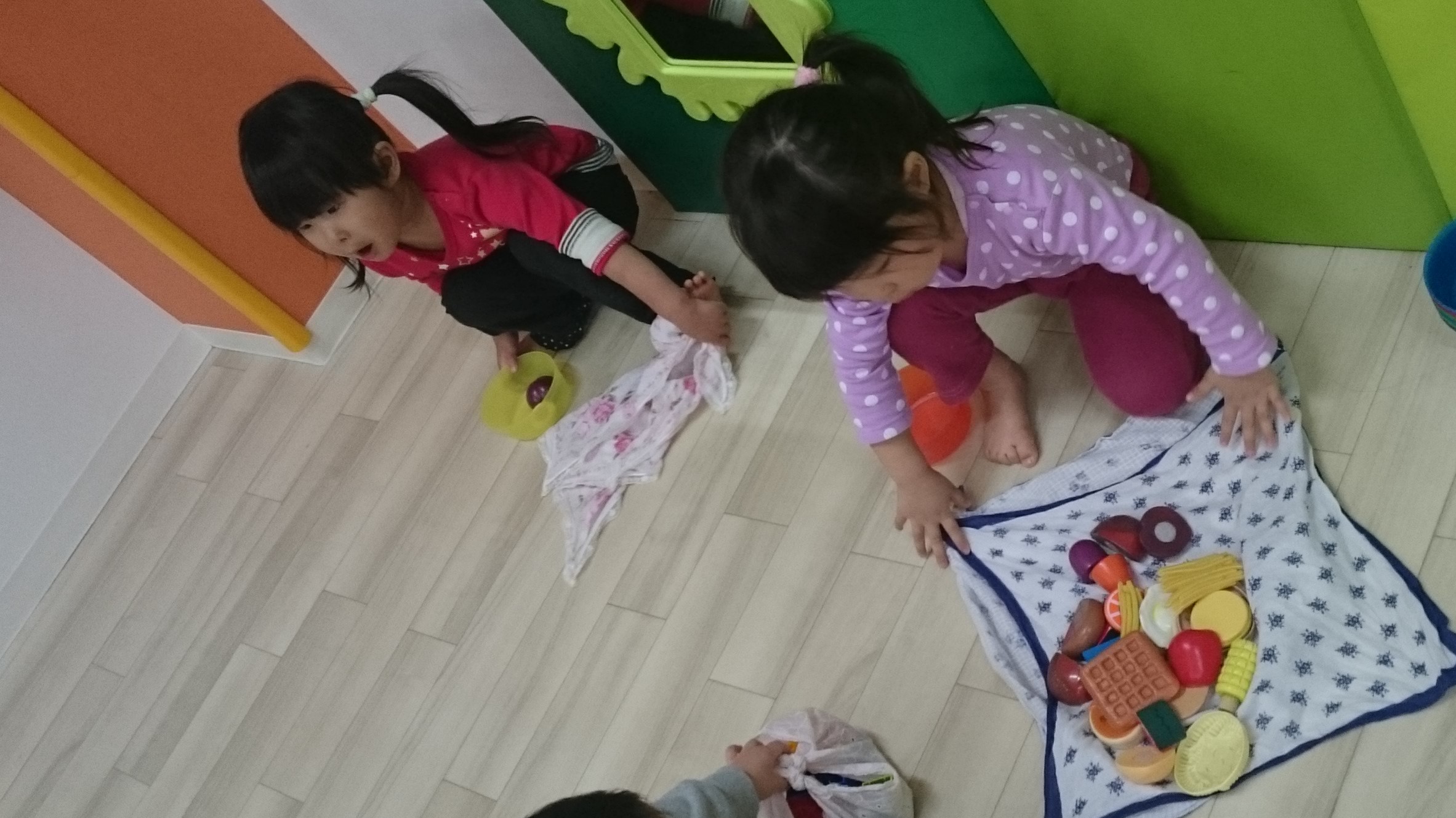1枚の布におままごとの食べ物を包んで「おべんとう」をつくっています。