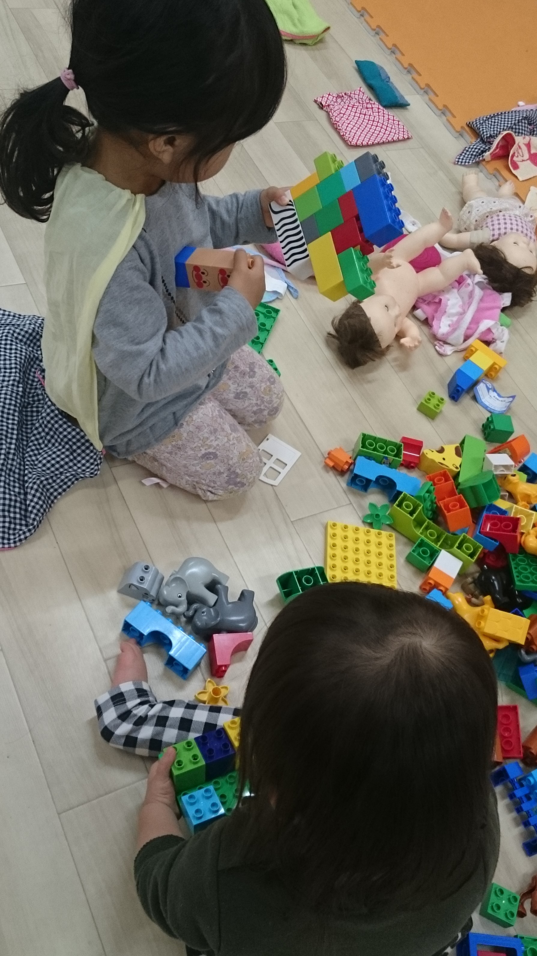 1歳上のおねえちゃんがつくるブロックをじっと見ながら・・・