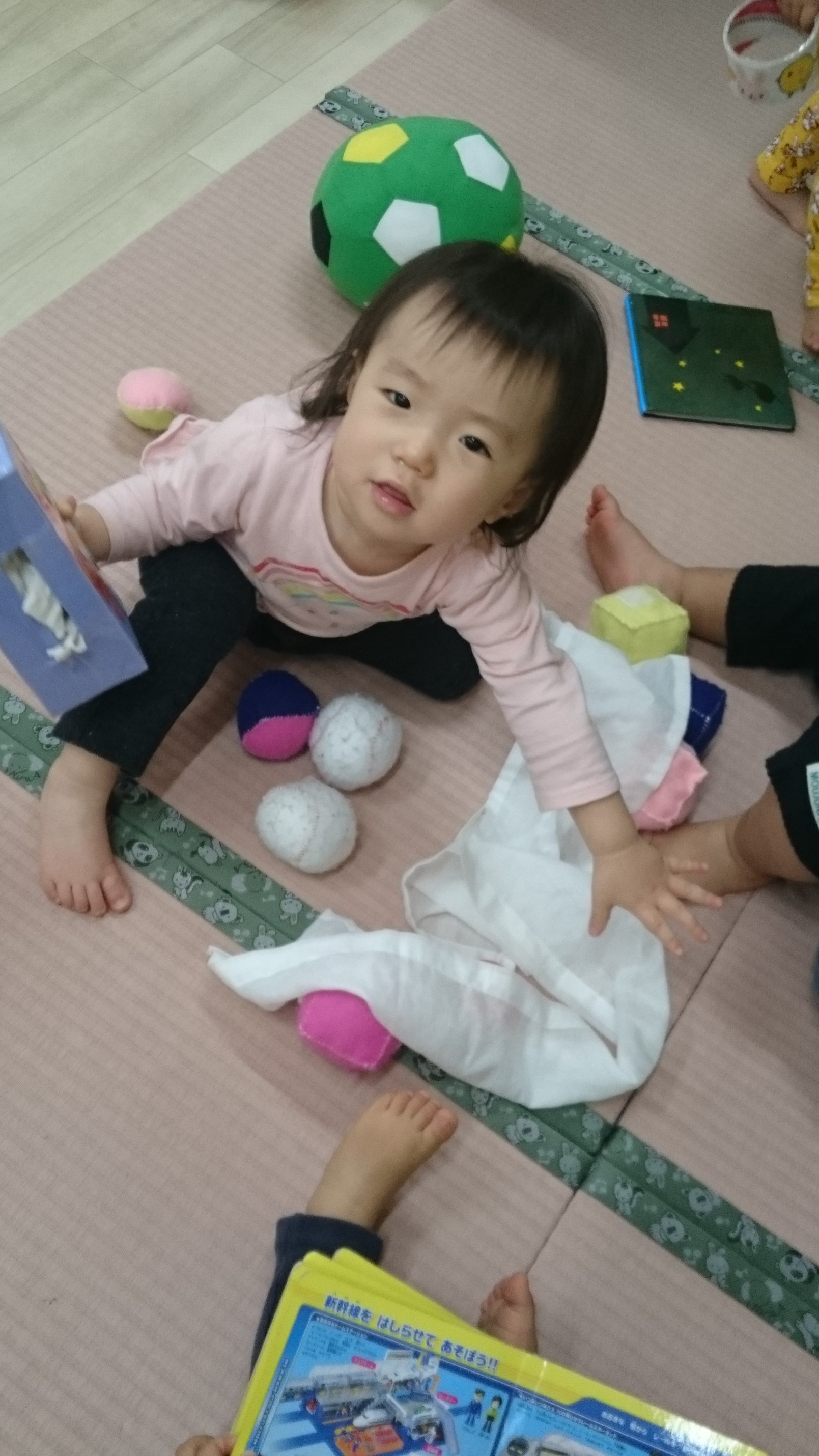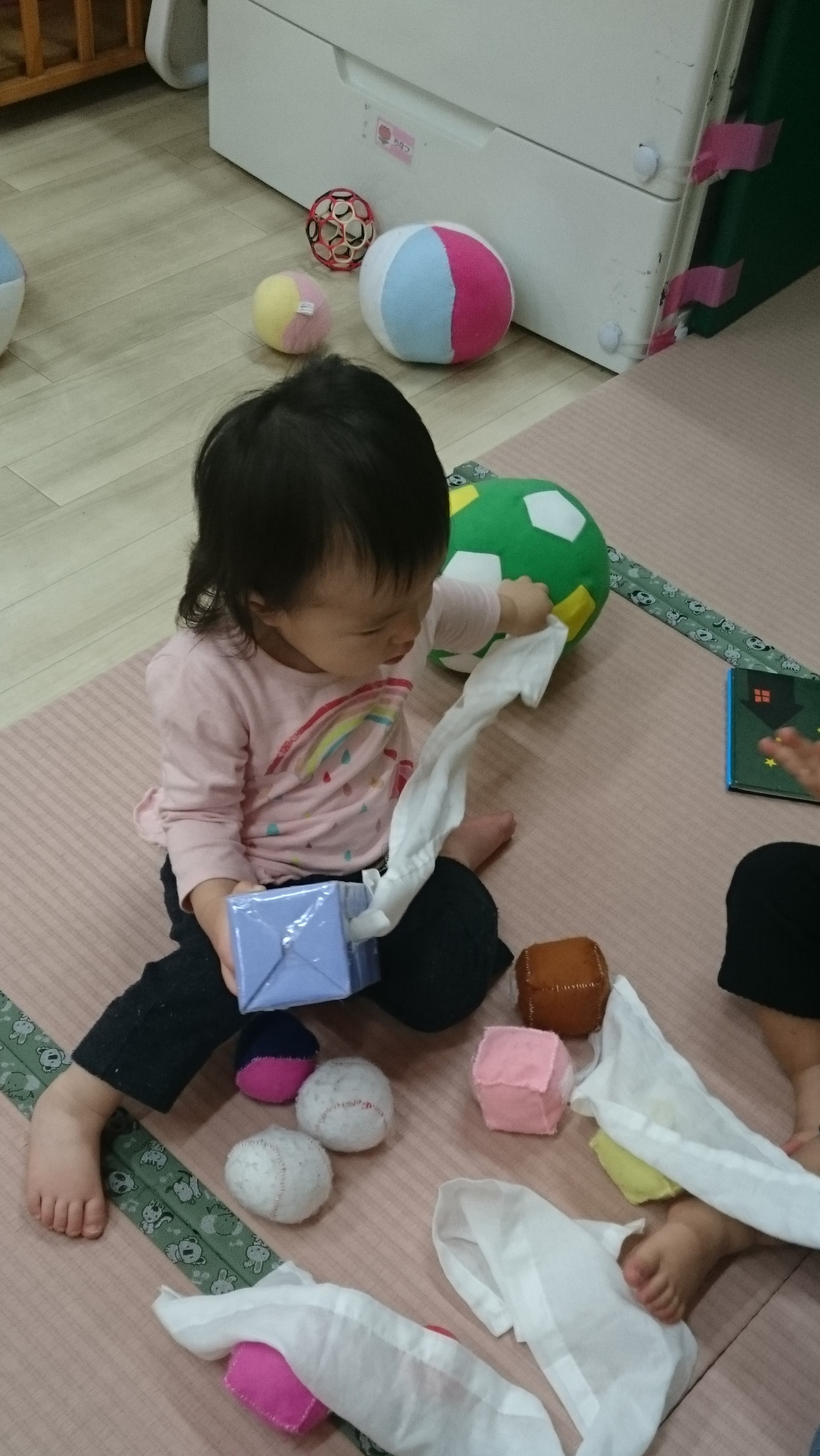 子どもたちがせっせと出したおもちゃのティッシュ(布)を隣でせっせと折りたたんではまた箱にしまう先生。